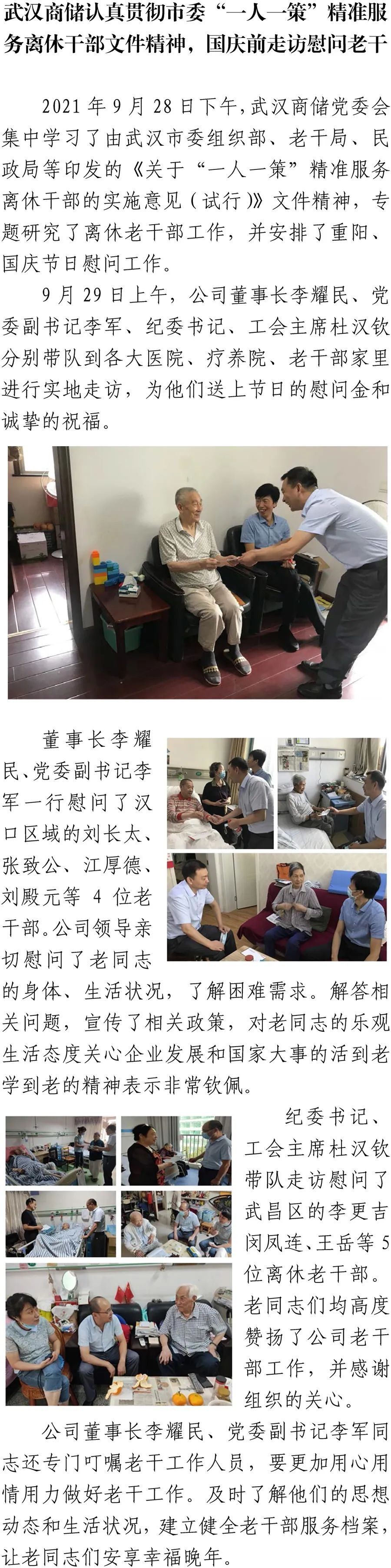 武漢商儲貫徹落實武漢市《關(guān)于“一人一策”精準(zhǔn)服務(wù)離休干部的實施意見(試行)》 時間:2021-09-30 點擊量:次